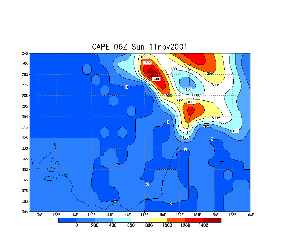 I cannot recall the forecast values, but the AVN model analysis for 06z shows LI of -2 to -4 and CAPE over 1000 for the Northern Rivers. Surface and 850 relative humidity was high with some drier air to the west at 500hPa. A NW jet of around 90 knots was in place with NW winds established down to about 850hPa where they veered to the north. At the surface S-SE winds were intruding into the far North Coast. The temperature at 500hPa was about -11, so all in all a very good set of figures for thunderstorms including severe weather and the possibility of supercells. The great thing about NW steering flow setups is that storms forming in SE Queensland or the Border Ranges end up in the Northern Rivers, and are usually easily to view and intercept. However, it does make it hard for chasing cells that form on the Richmond Range well to the southwest.