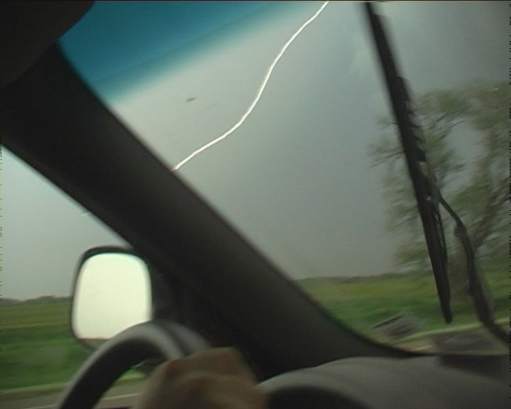 Dashing south was a safe move since the road ahead was gravel � certainly not the best road to contend such atmospheric violence. The tornado approached rapidly but curving northeast allowing us ample time to reposition to its southeast. Little time was wasted setting up tripod. I took a breather at this point. I guess it was time to relax and enjoy our catch of the day - an eerie scene of green pastures contrasted by this rotating mass of dirt. Then suddenly, almost to script, whilst filming the tornado, a herd of cattle race in the direction of the tornado from off screen - a scene from Twister? Hmmm not sure what they were thinking � perhaps instinct suggested danger. The rear flank downdraft hooked around spraying rain onto my camera � end of the tornado show. The tornado had become rain-wrapped anyway.